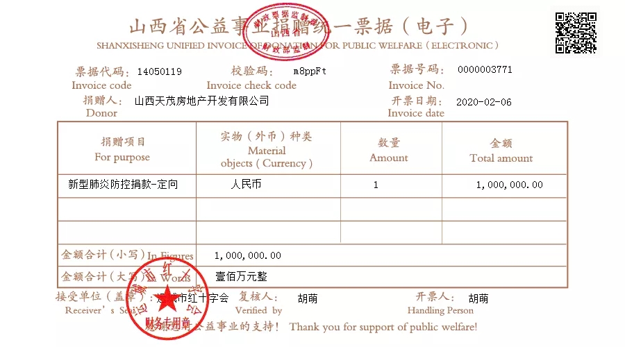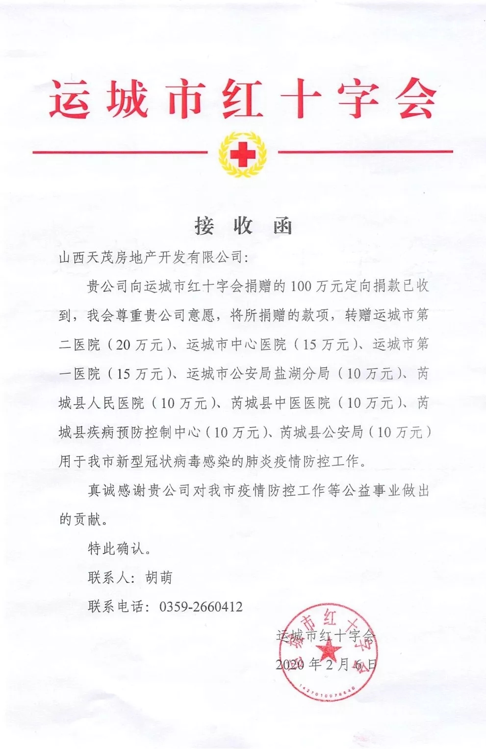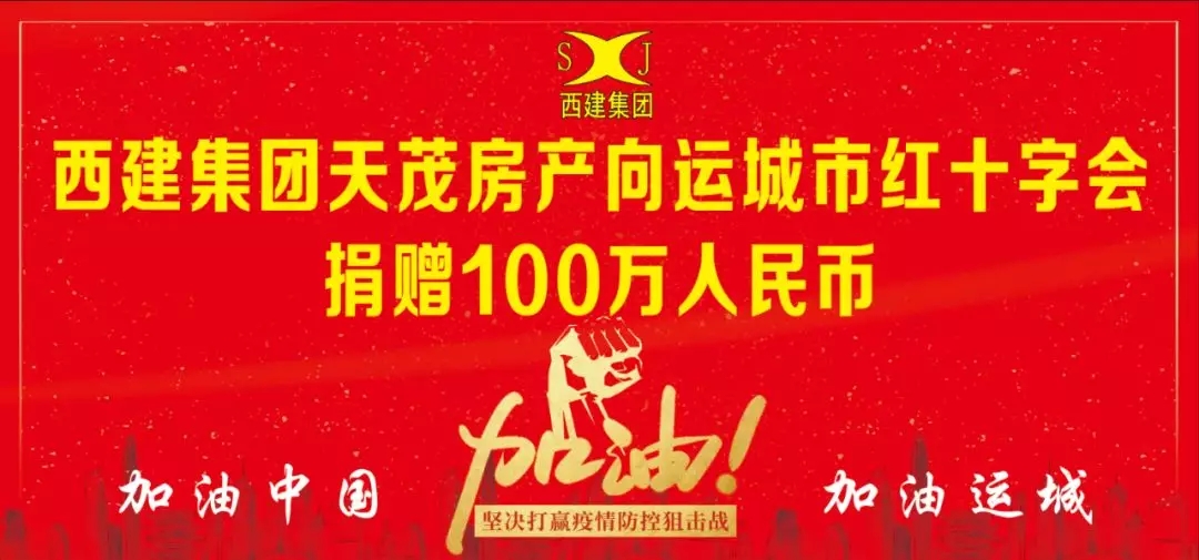 為了抗擊疫情、共渡難關,西建集團天茂房產通過運城市紅十字會向“運城市第二醫院(20萬元)、運城市中心醫院(15萬元)、運城市第一醫院(15萬元)、運城市公安局鹽湖分局(10萬元)、芮城縣人民醫院(10萬元)、芮城縣中醫醫院(10萬元)、芮城縣疾病預防控制中心(10萬元)、芮城縣公安局(10萬元)”共捐贈人民幣100萬元,用于我市新型冠狀病毒感染的肺炎疫情防控工作和其他公益事業。