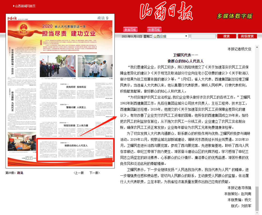 “為切實(shí)維護(hù)農(nóng)民工合法權(quán)益,我們企業(yè)帶頭做好涉及農(nóng)民工的各項(xiàng)工作?!毙l(wèi)耀民1992年到西建集團(tuán)工作。先后任集團(tuán)運(yùn)城分公司技術(shù)負(fù)責(zé)人、主任工程師、技術(shù)總工,西建集團(tuán)副總經(jīng)理。2019年,他提交的《關(guān)于加速落實(shí)農(nóng)民工工資保障金差異化的建議》,有效改善了企業(yè)支付農(nóng)民工工資難的困境。他所在的西建集團(tuán)成立39年來,始終把農(nóng)民工的利益放在首位,從不拖欠農(nóng)民工一分錢工資,企業(yè)建立了農(nóng)民工實(shí)名制臺(tái)賬,確保農(nóng)民工工資正常發(fā)放;企業(yè)每年都會(huì)為農(nóng)民工兄弟免費(fèi)健康體檢等。