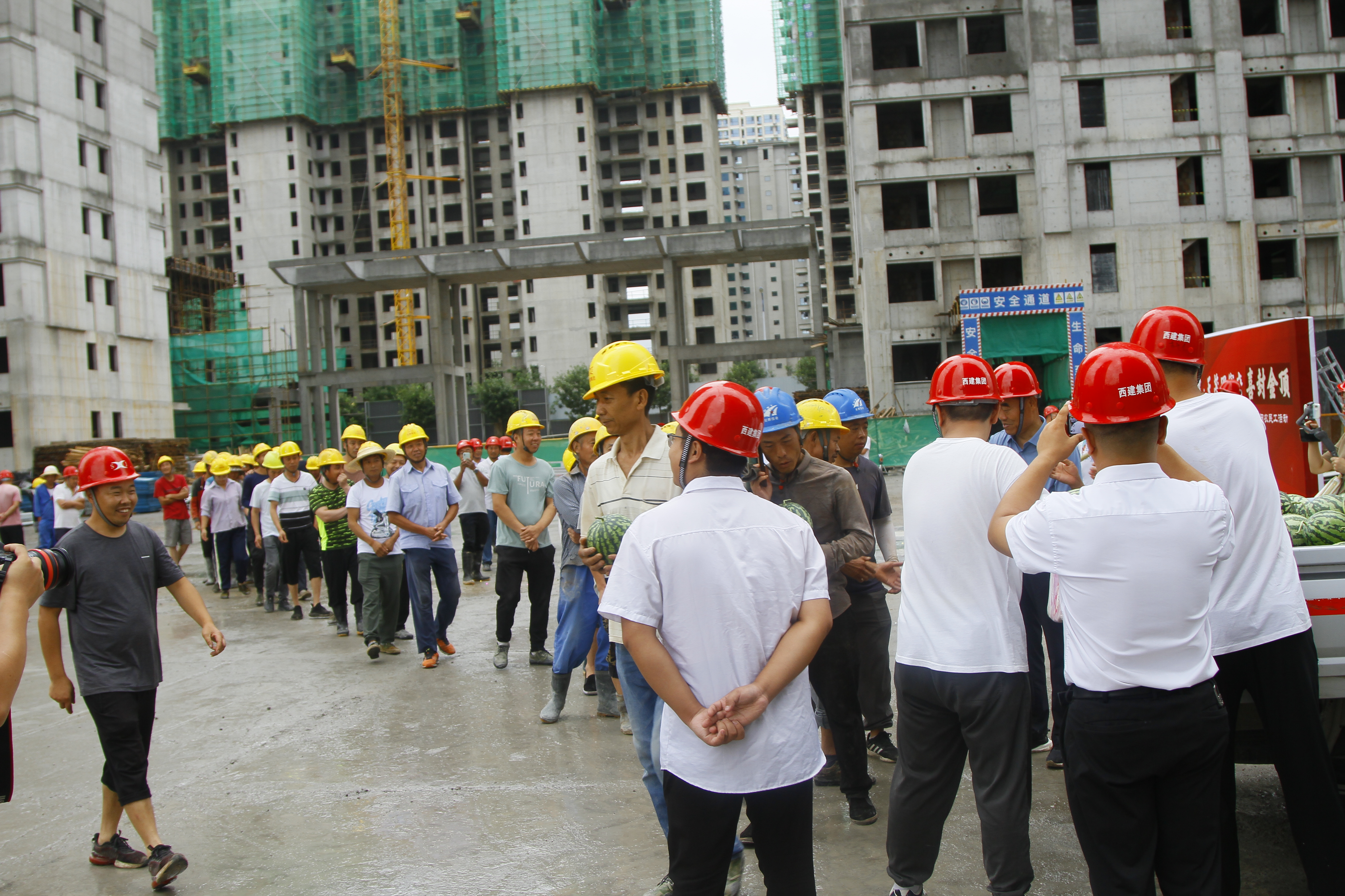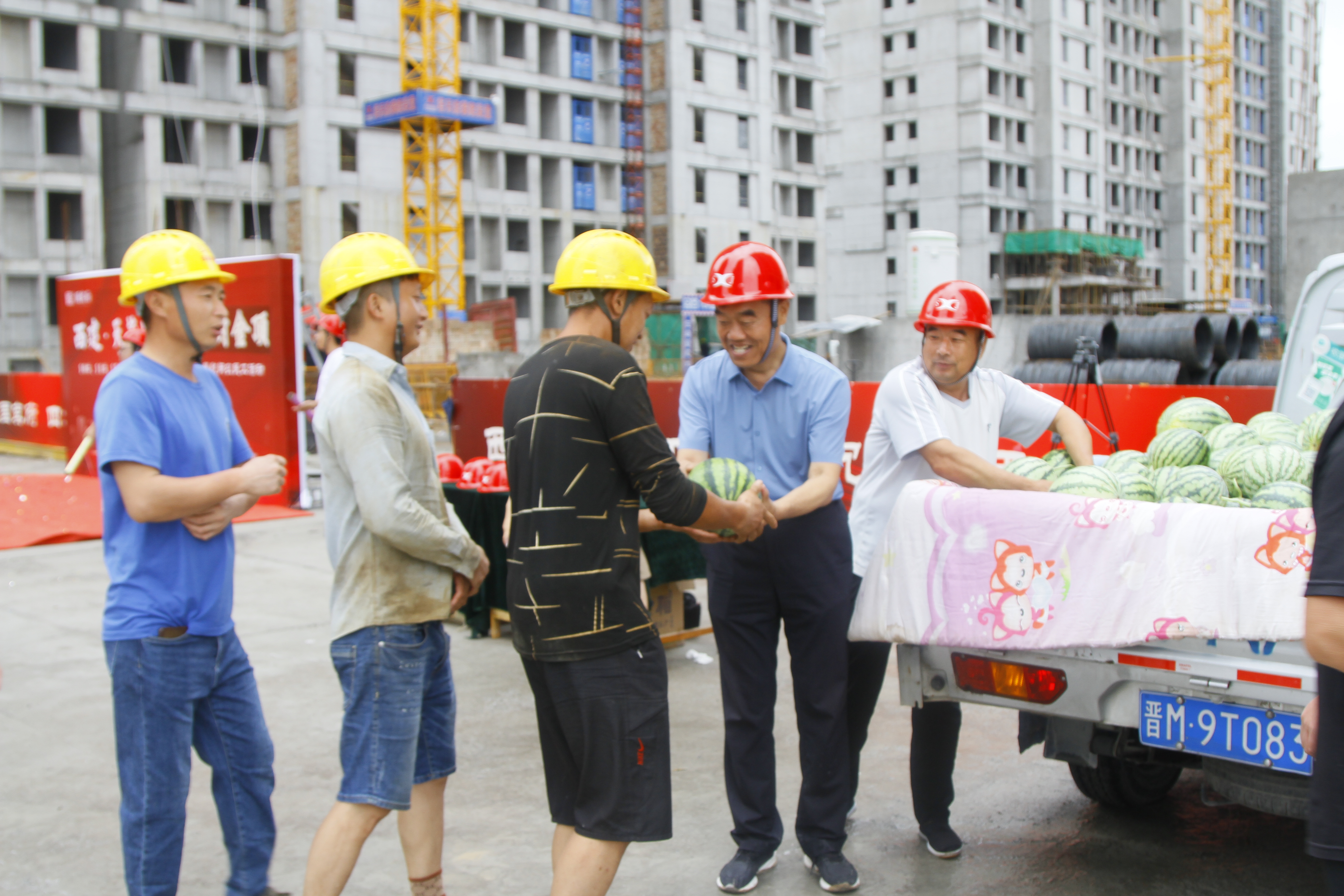 此次活動特意邀請農民工兄弟代表參加,并為他們發放消暑用品,致以感謝