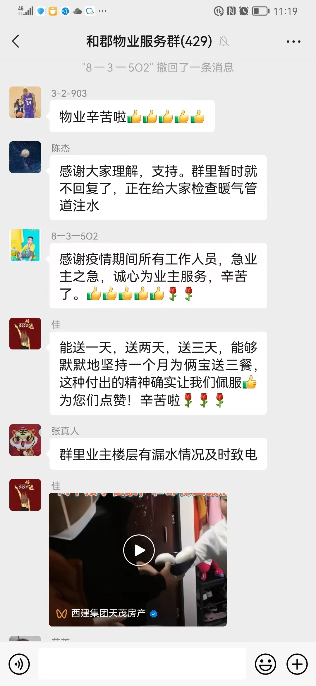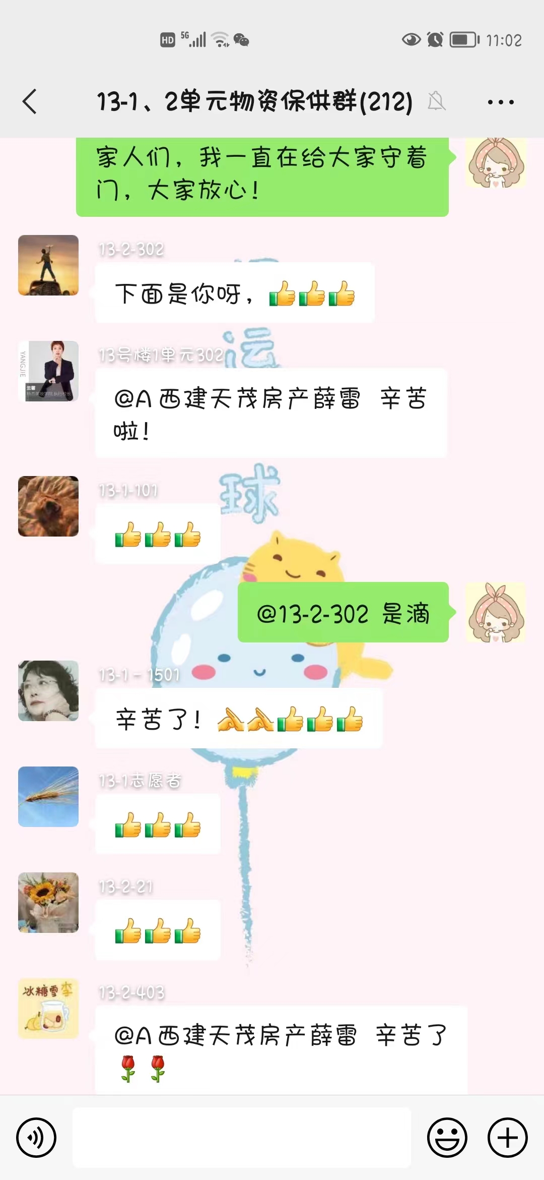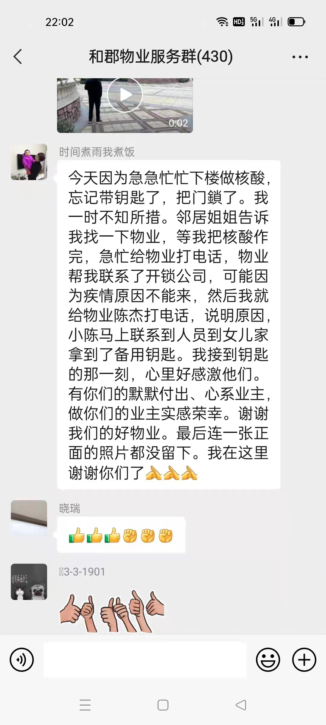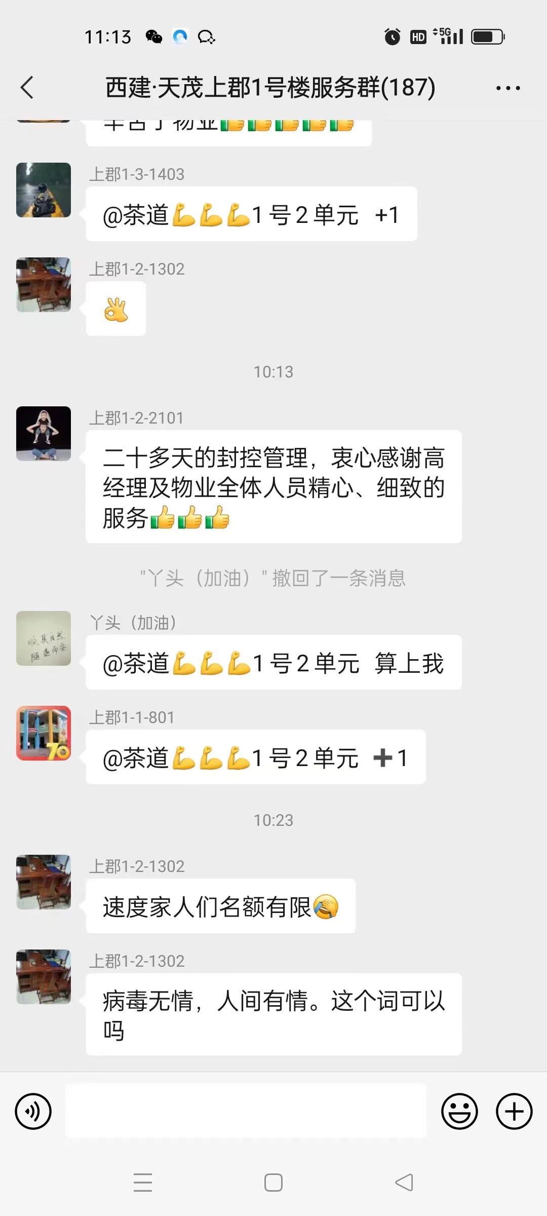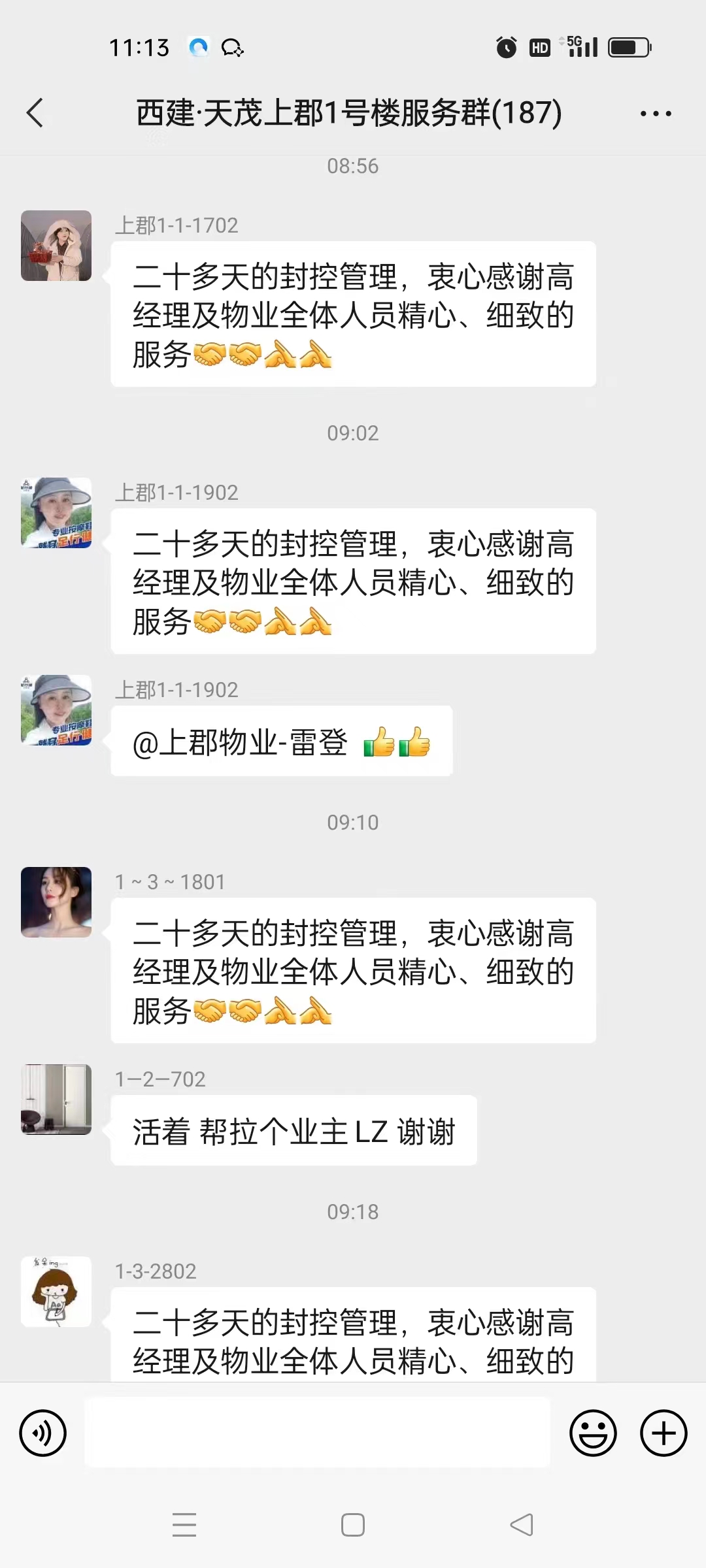 封控命令下達后,所有人員在最短時間內立即返崗,對小區進行分片區分樓棟管理,他們每天凌晨5:30就奔赴崗位開始一天的忙碌,準備核酸檢測、采購業主所需物資、小區內巡邏執勤等等,每天都能看到晚上12點還在工作的他們。以下為三個小區業主在群內對物業工作人員的稱贊!