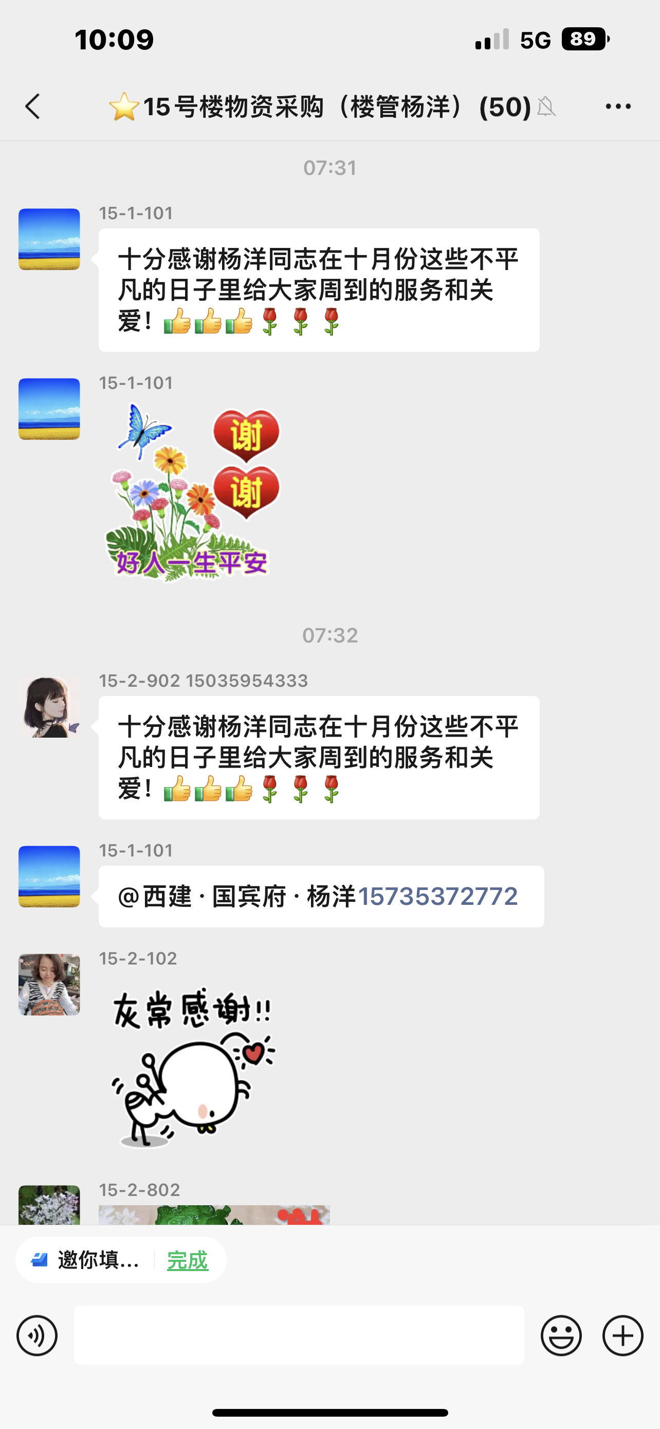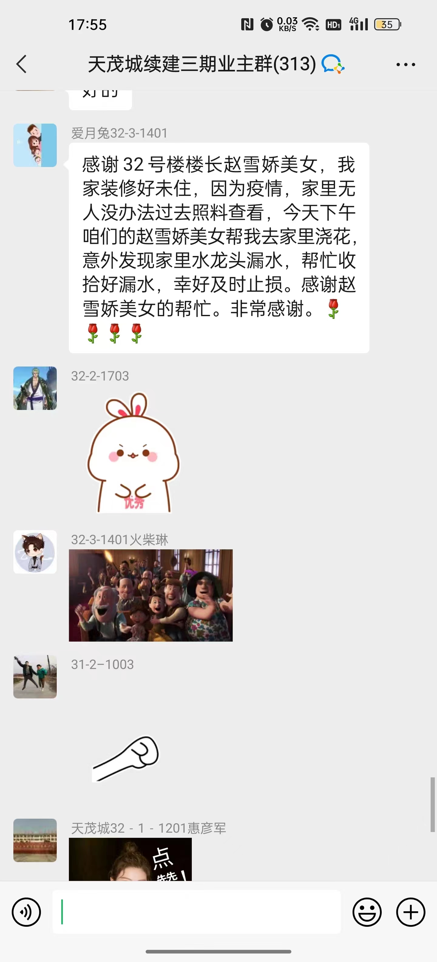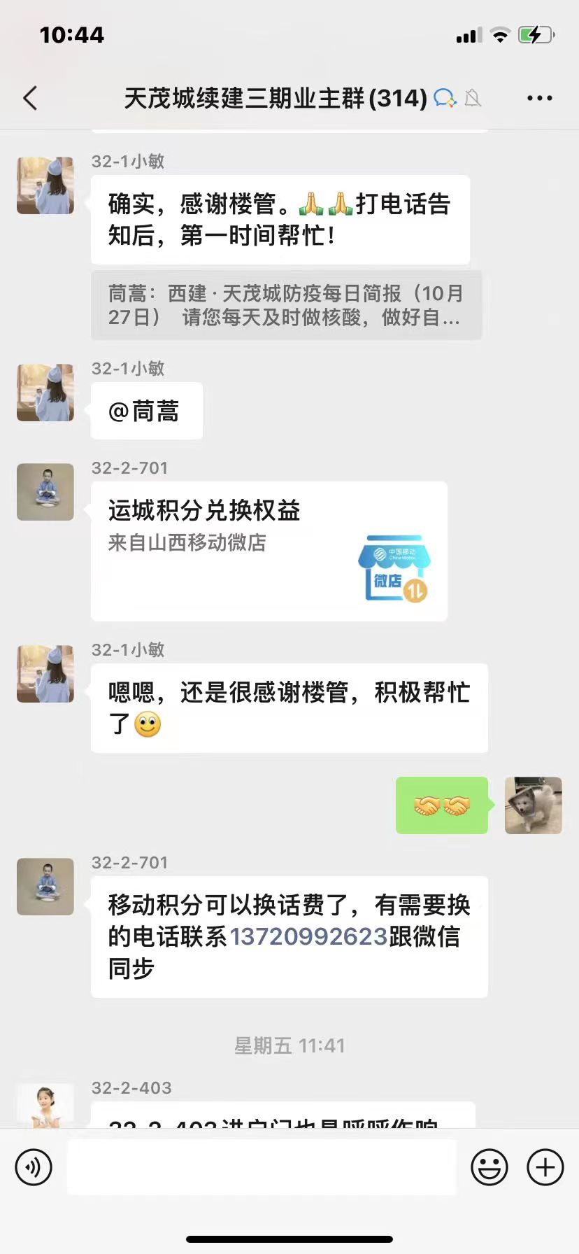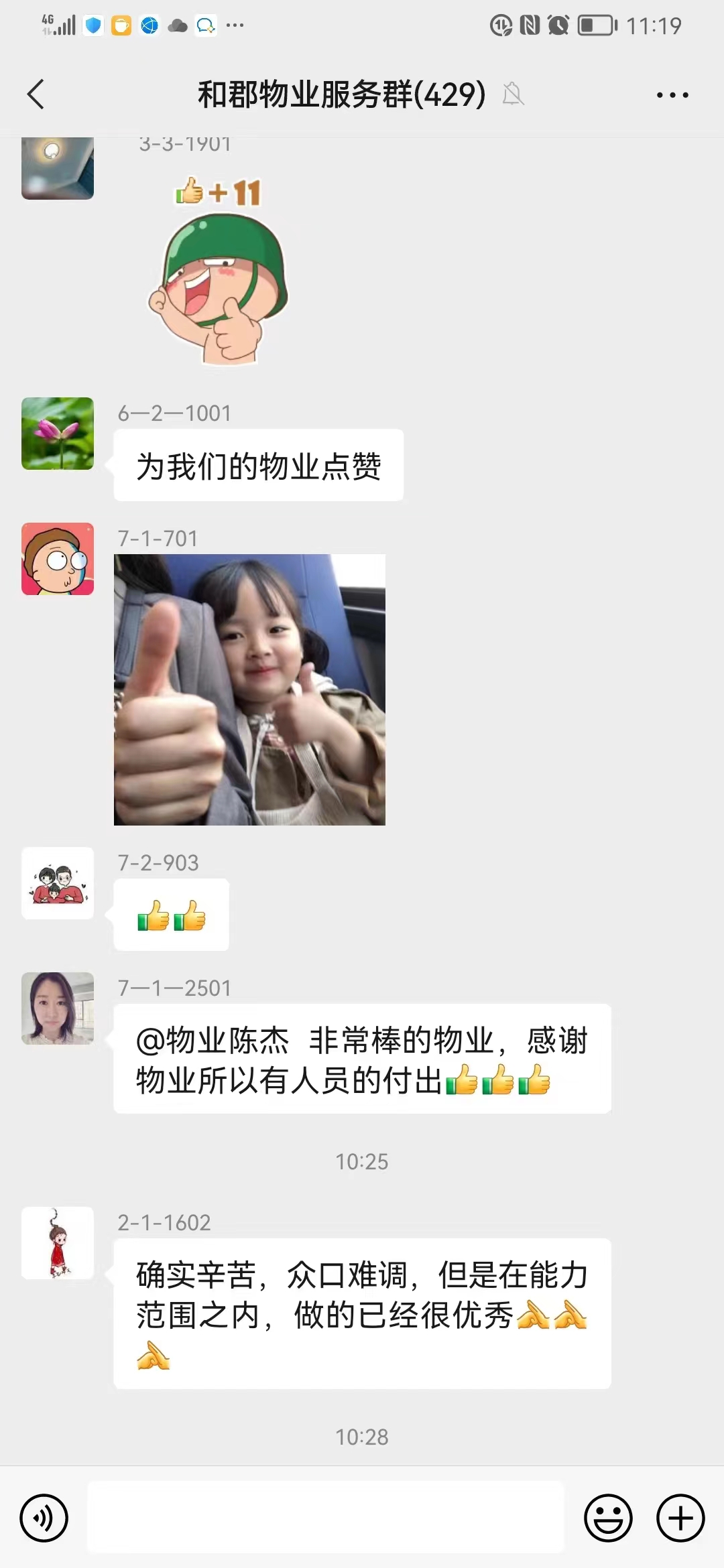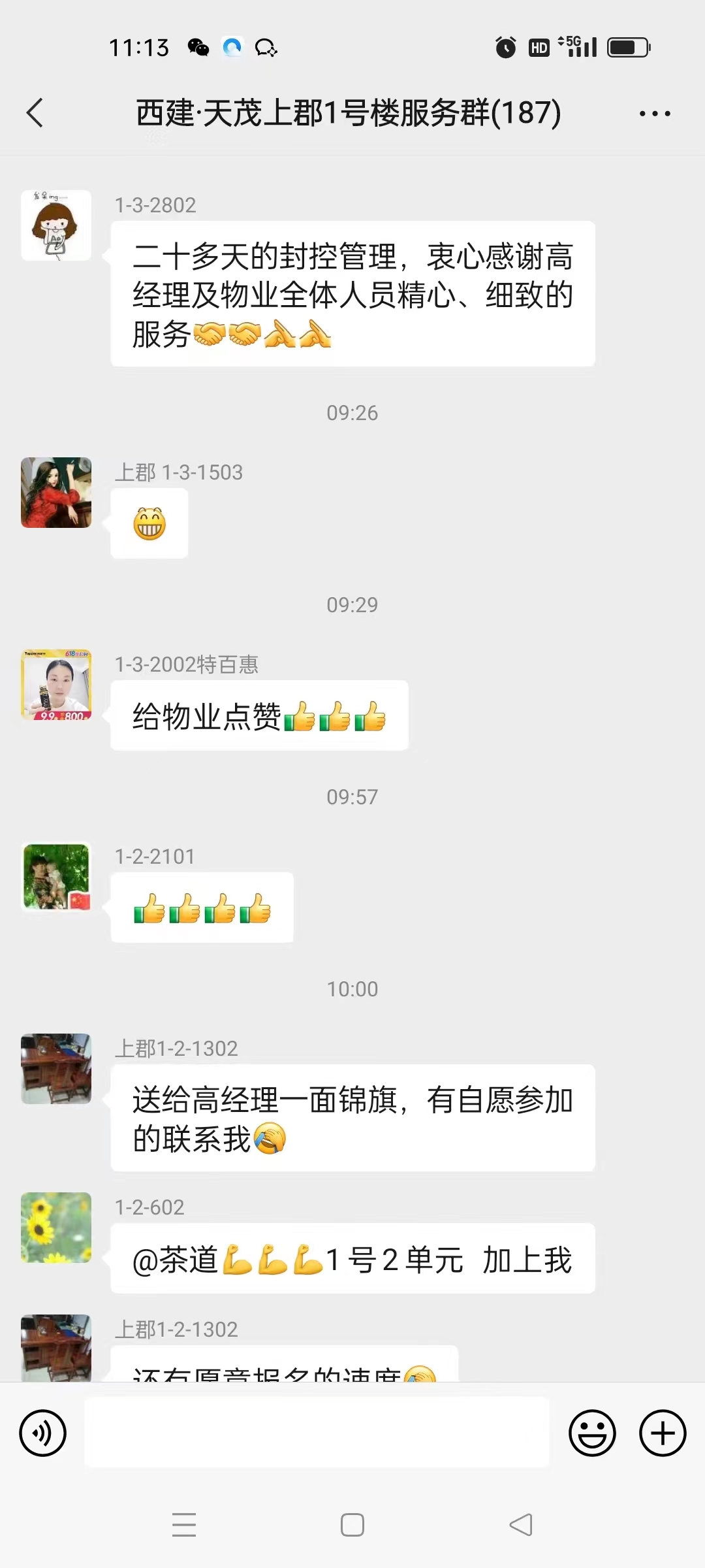 封控命令下達后,所有人員在最短時間內立即返崗,對小區進行分片區分樓棟管理,他們每天凌晨5:30就奔赴崗位開始一天的忙碌,準備核酸檢測、采購業主所需物資、小區內巡邏執勤等等,每天都能看到晚上12點還在工作的他們。以下為三個小區業主在群內對物業工作人員的稱贊!