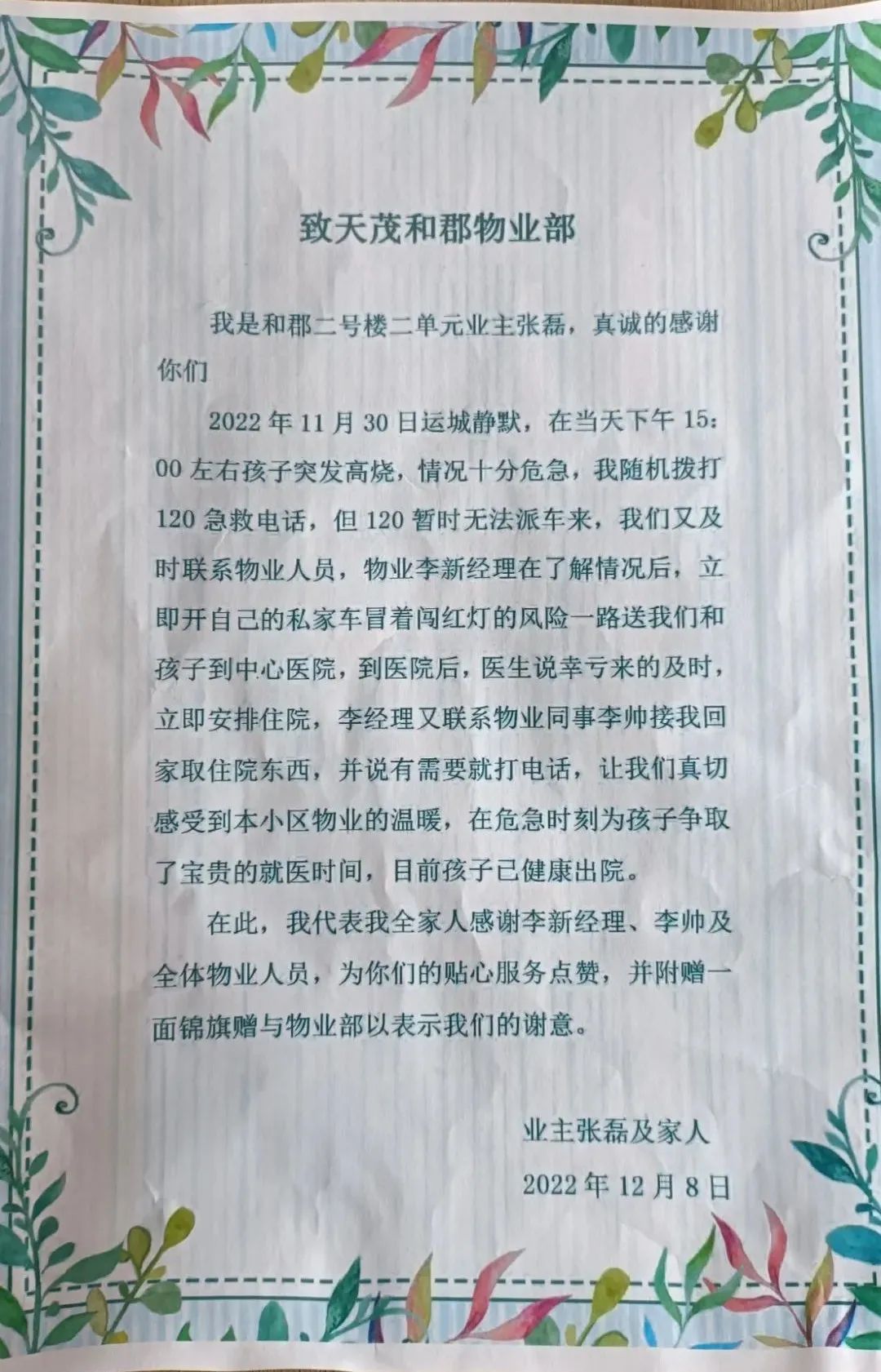 西建·天茂和郡業(yè)主張磊孩子突發(fā)高燒,在120暫時無法派車的情況下,物業(yè)經(jīng)理迅速用自己的車,冒著闖紅燈的風(fēng)險將孩子送往醫(yī)院,為孩子爭取了寶貴的就醫(yī)時間。業(yè)主在信里說道:真切感受到物業(yè)的溫暖,真誠感謝李新經(jīng)理、李帥及全體物業(yè)人員。