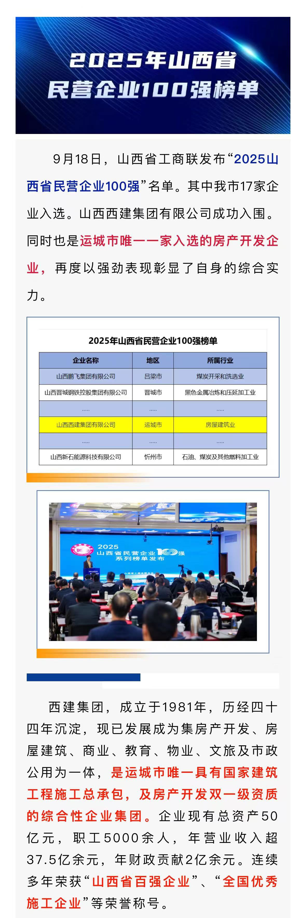 喜報!西建集團再次榮登“ 2025 年山西省民營企業 100 強”